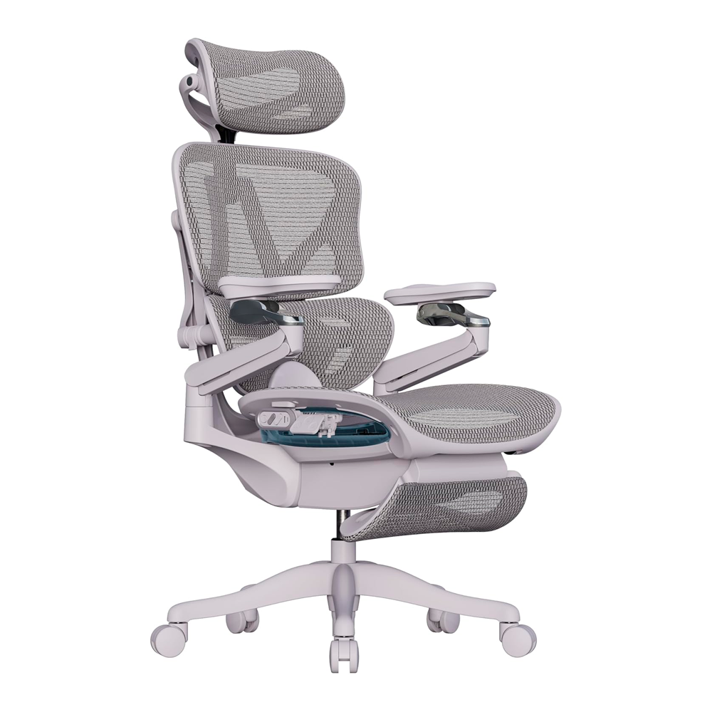 CADEIRA ERGONOMICA EOS COM AJUSTE ELETRICO E DESCANSO DE PES BRANCO E CINZA