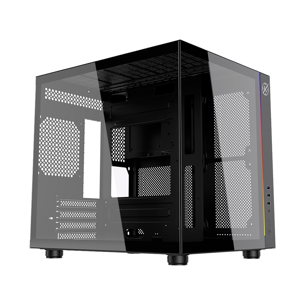 - Painéis frontal e lateral em vidro temperado proporcionando uma vista quase ininterrupta dos componentes internos