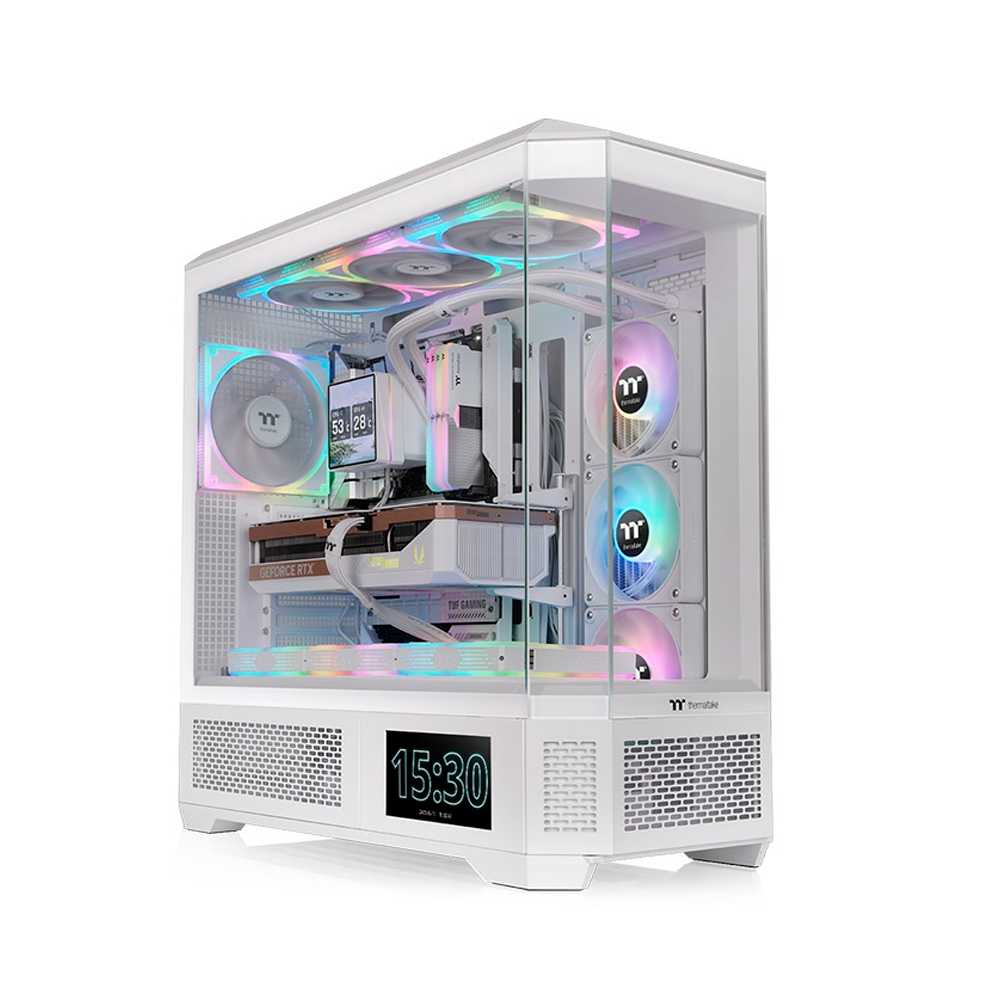 O View 600 TG Snow da Thermaltake é um gabinete Full Tower combina estrutura robusta com visual marcante e sofisticado com seu design na cor branca. Com quatro painéis de vidro temperado de 4 mm, oferece ampla visibilidade dos componentes e acabamento premium. Compatível com placas-mãe E-ATX, incluindo modelos com conectores ocultos da ASUS, MSI e GIGABYTE. Conta com espaço para até dez ventoinhas de 120/140 mm e radiadores de até 420 mm, entregando excelente fluxo de ar. Os slots PCI-E rotativos permitem instalação horizontal ou vertical da GPU (com riser opcional), e o suporte integrado evita o empenamento da placa. Filtros de poeira no topo, base e lateral protegem o sistema, enquanto a estrutura interna acomoda até três HDDs e três SSDs. O painel I/O no topo oferece conexões USB 3.0, USB-C e áudio HD.