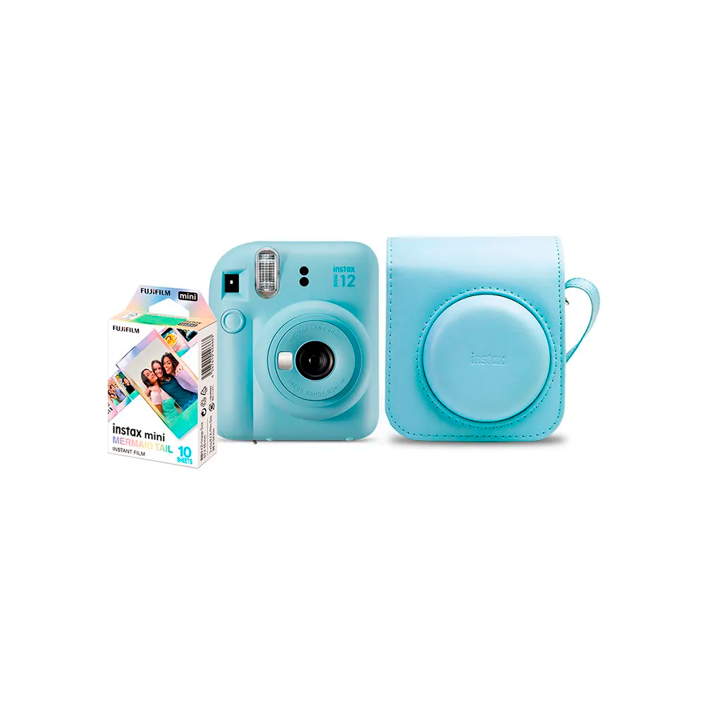 Kit Câmera Instantânea Fujifilm Instax Mini 12 Azul + Pack 10 Filmes Mermaid Tail + Bolsa Azul Candy